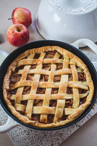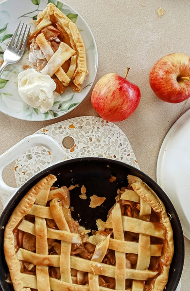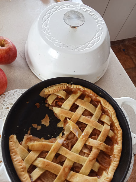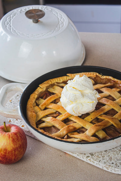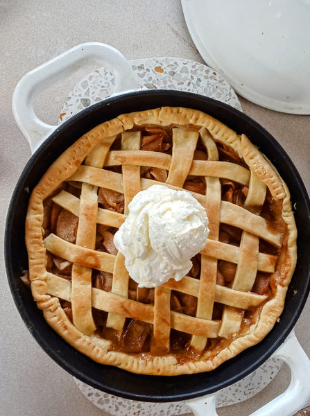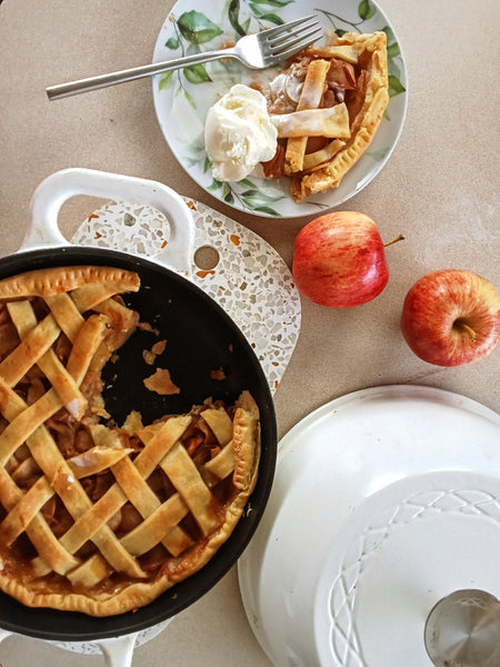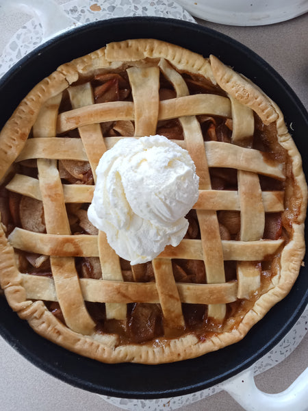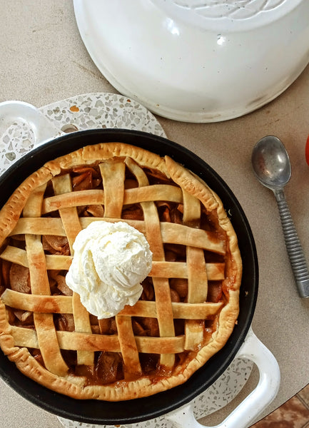 There’s something timeless about the scent of apple pie wafting through the kitchen—warm cinnamon, buttery crust, and the sweet-tart richness of baked apples. This version, baked nice and slow in a Krustic Dutch oven, adds a rustic charm and unbeatable depth of flavor that only cast iron can deliver. The even heat distribution creates a perfectly golden crust, while the sealed environment locks in moisture, allowing the apples to soften into a luscious filling.