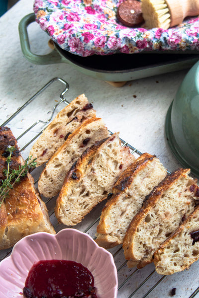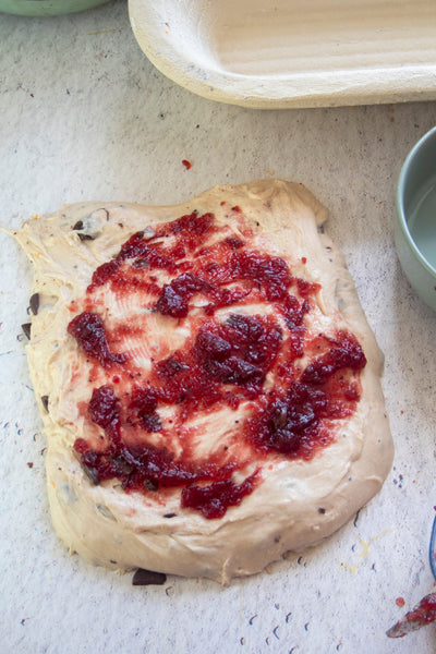 The perfect loaf for a festive breakfast or sweet dessert. Studded with dark chocolate and cranberry sauce swirled into the dough, this bread is slightly sweet, slightly tangy, and had a delicious chewy texture. Rustic and delicious, spread with plenty of butter and eat warm for a comforting treat.