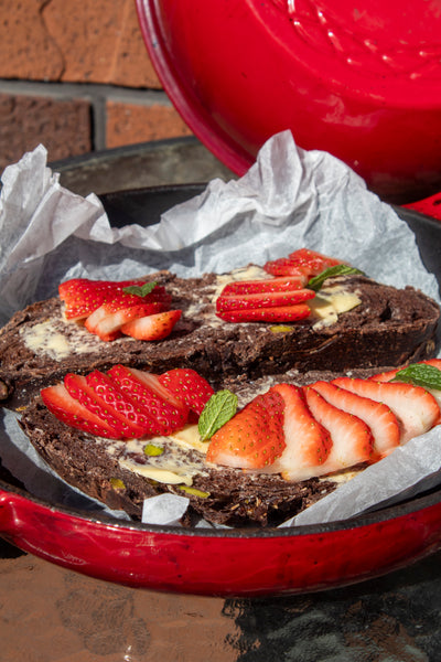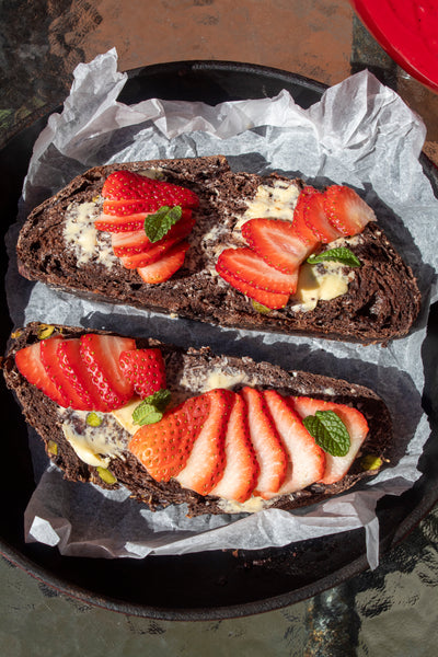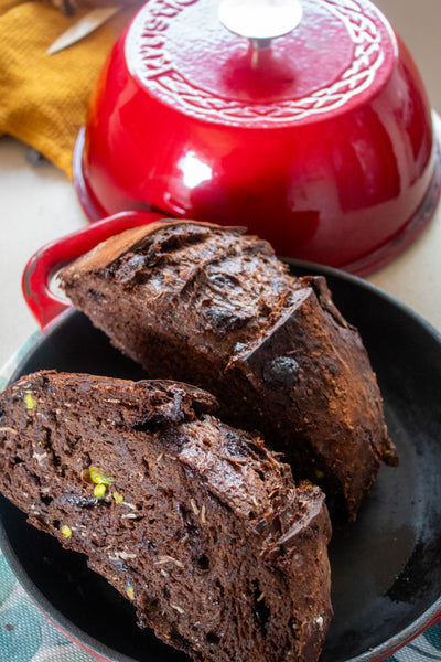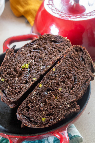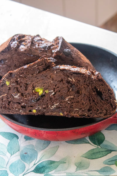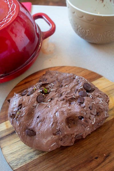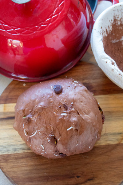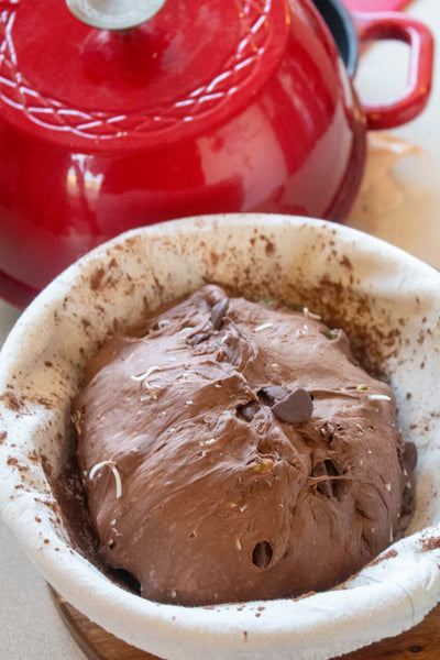 - Place in a banneton dusted with cocoa. Rest 30 minutes then stitch the dough together. Refrigerate over night.