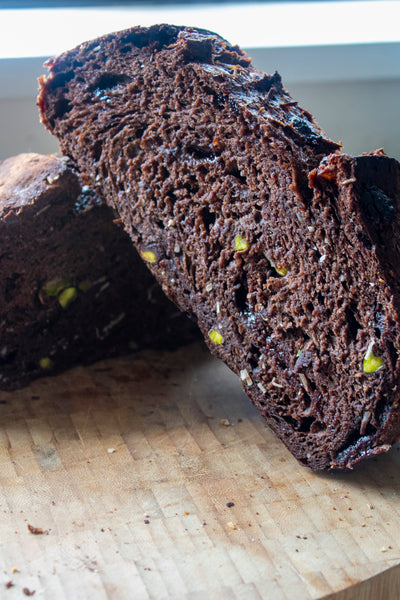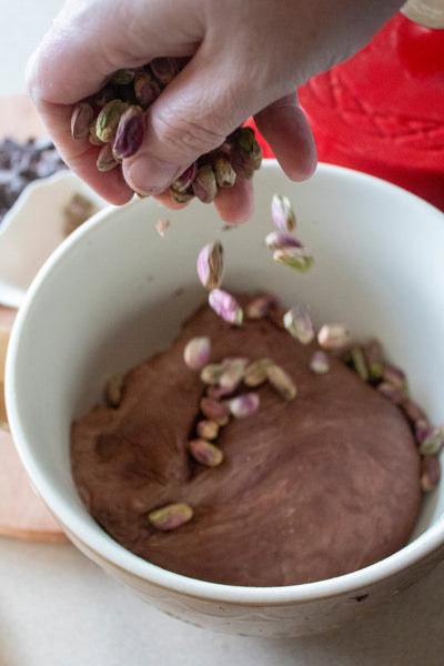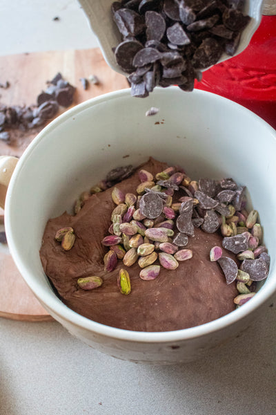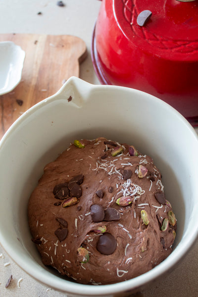 - Cover and rest 1 hour. Add salt and use your hands to fold through. Cover and rest 1 hour. Add the chocolate, pistachio and coconut and stretch and fold the dough four times.