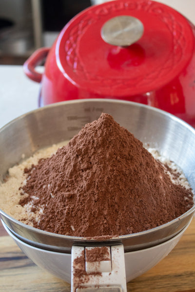 - Mix starter and water together, then add flour, cocoa, sugar and mix well to form a shaggy dough.