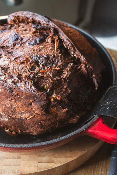 - Score, then bake with the lid on for 30 minutes. Remove lid, turn heat down to 425F and bake a further 20 minutes.