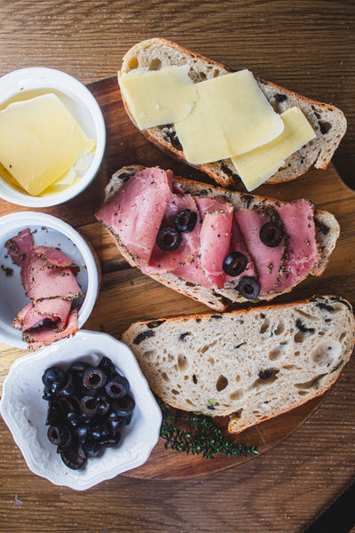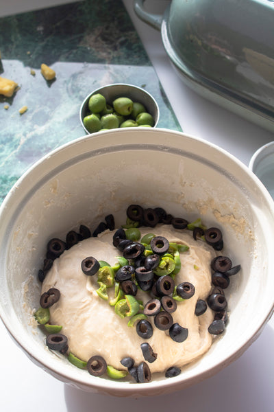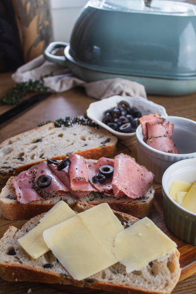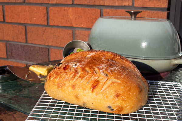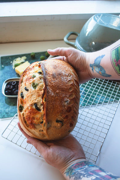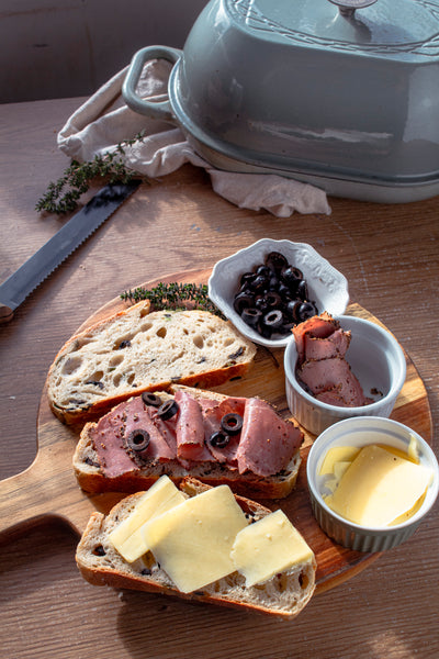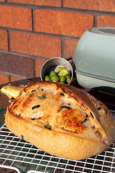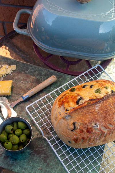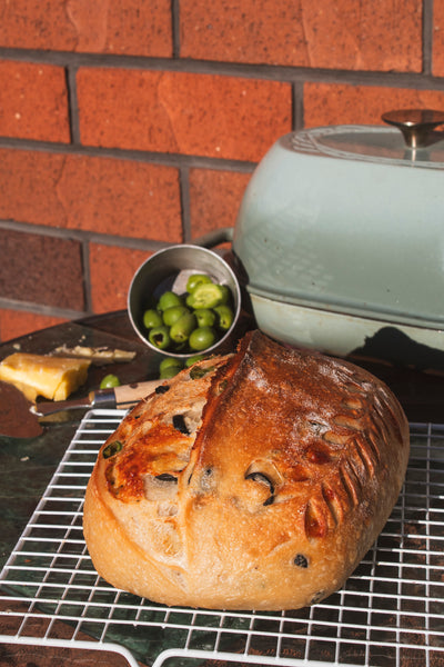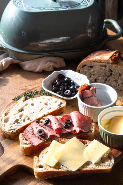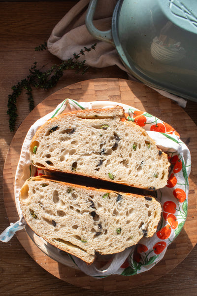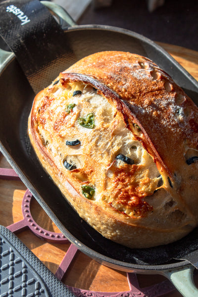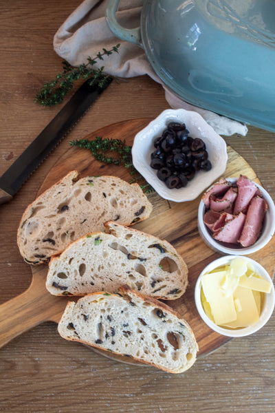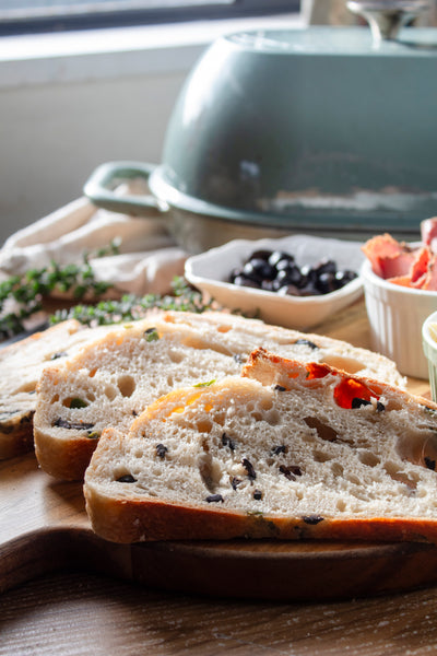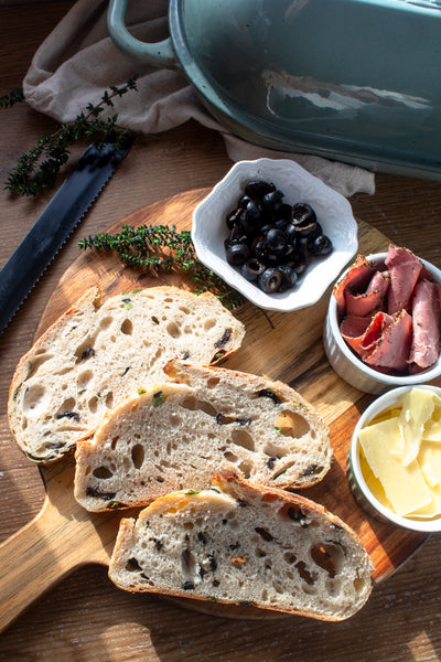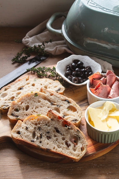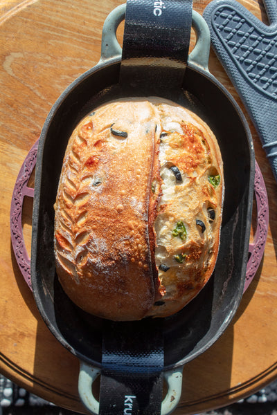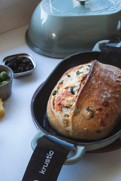 This is great to add to your summer picnic spread, or used for sandwiches and toast. The olives add a delicious salty tang and the thyme nad parmesan make this a super flavorful loaf to try in your Krustic.