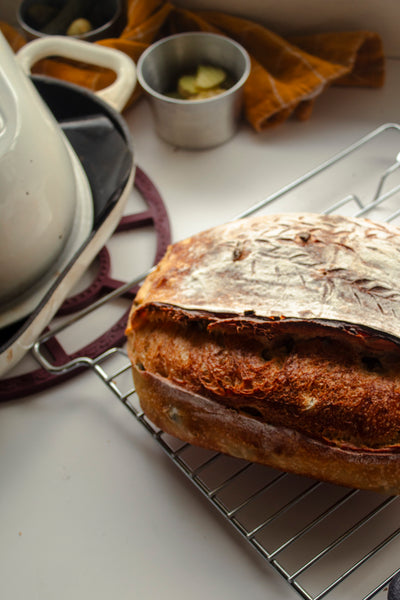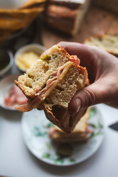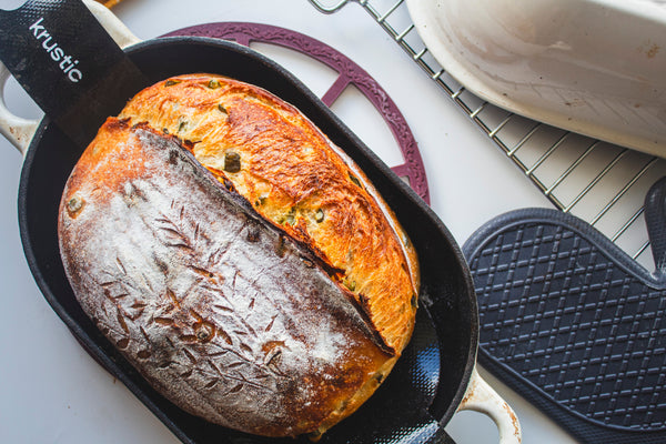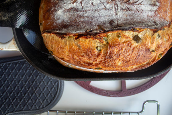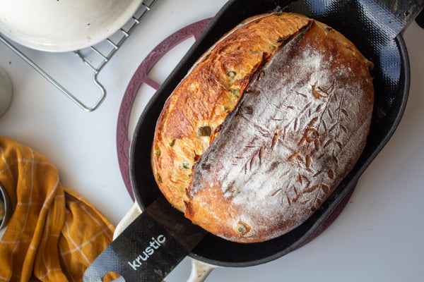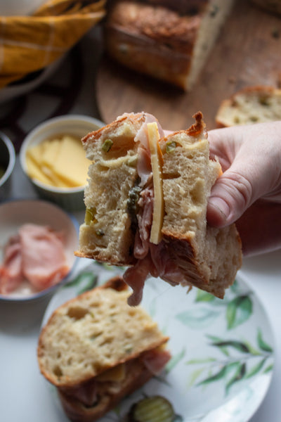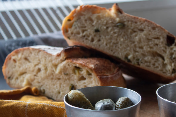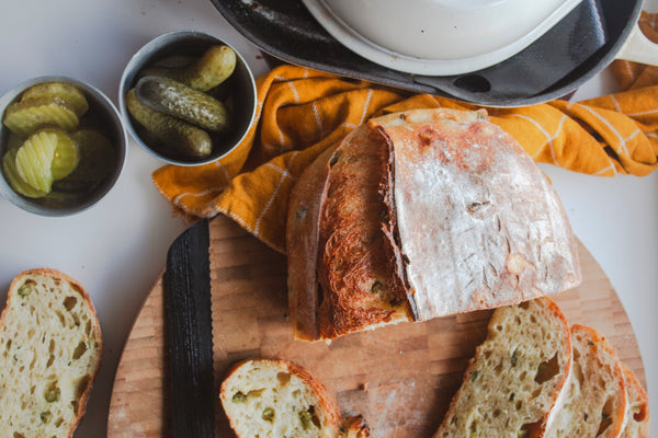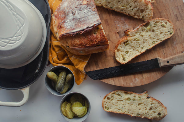 Sweet and delicious, this sourdough loaf has chopped up pickles folded through and pickle juice in the dough. Perfect for sandwiches or toasted and slathered with butter.