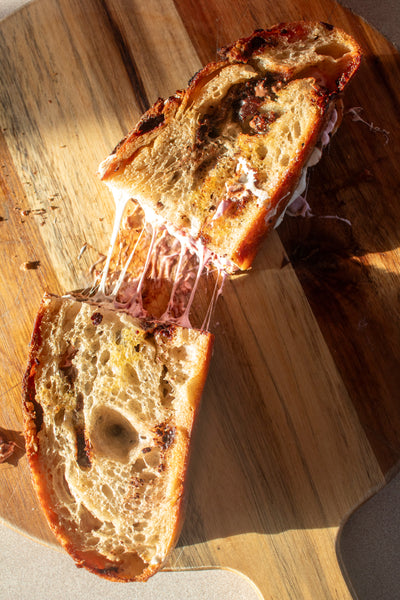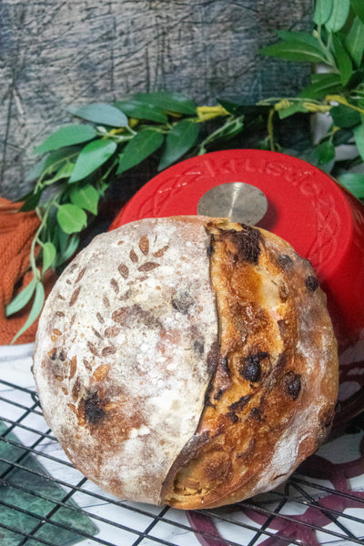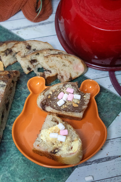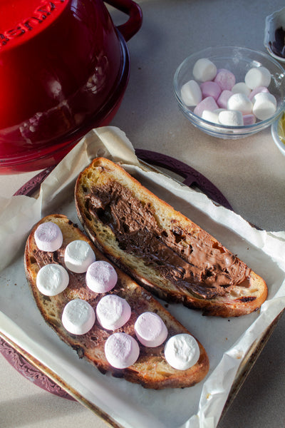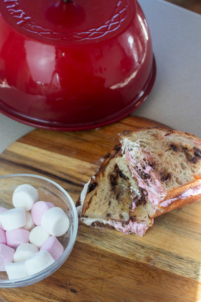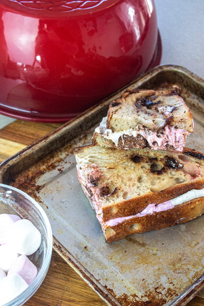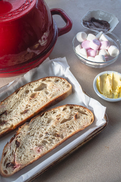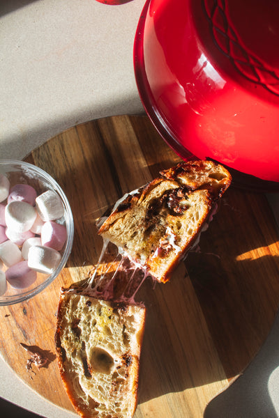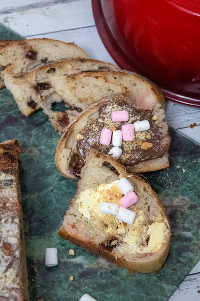 This is THE dessert bread of campfire season! Everything you love about smores, buttery crumbs, milk chocolate and marshmallow all rolled up into a delicious crusty sourdough loaf. The marshmallows dissolve into the bread giving it a beautiful sweet flavor studded with bits of chocolate. It’ll be sure to bring back memories of baking s'mores around a campfire- without the bug bites!