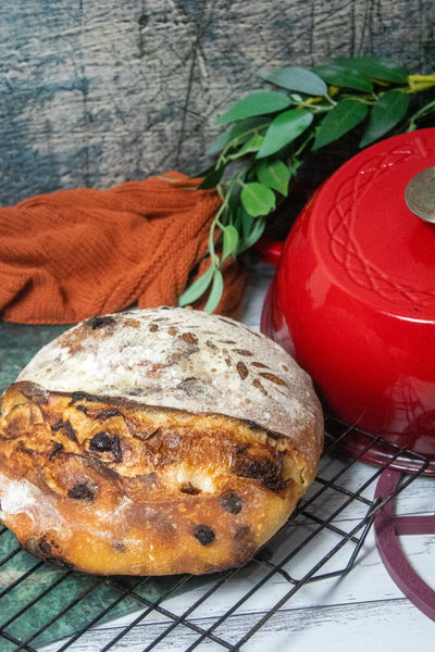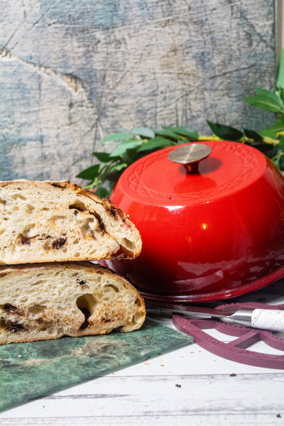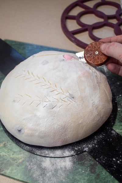12. Remove dough from fridge and place on the silicone baking mat. Brush off any excess flour and score one long expansion line across the dough. Place inside the Krustic and bake 7 minutes, re-score the expansion score, then return to the oven for a further 25 minutes.