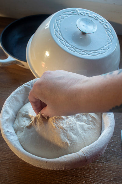 8. Place in a banneton. Rest an hour, then stitch the top together and refrigerate 24 hours (upt to 48 for extra flavor).