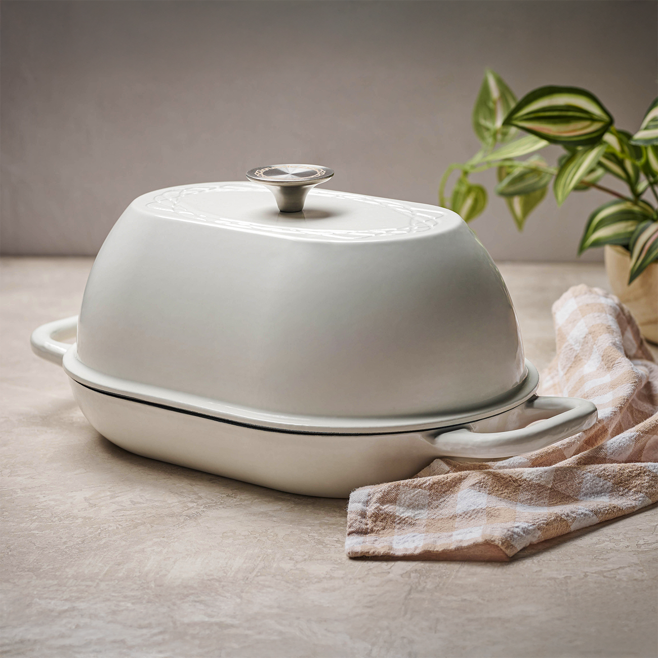 Ready to bake a loaf that looks and tastes like it’s straight out of your granny’s kitchen? This oven is made of indestructible cast iron for that heritage performance and flavor you know and love. A ceramic enamel helps your creation slide straight out of the pan and onto the table—no scrubbing or scraping needed.